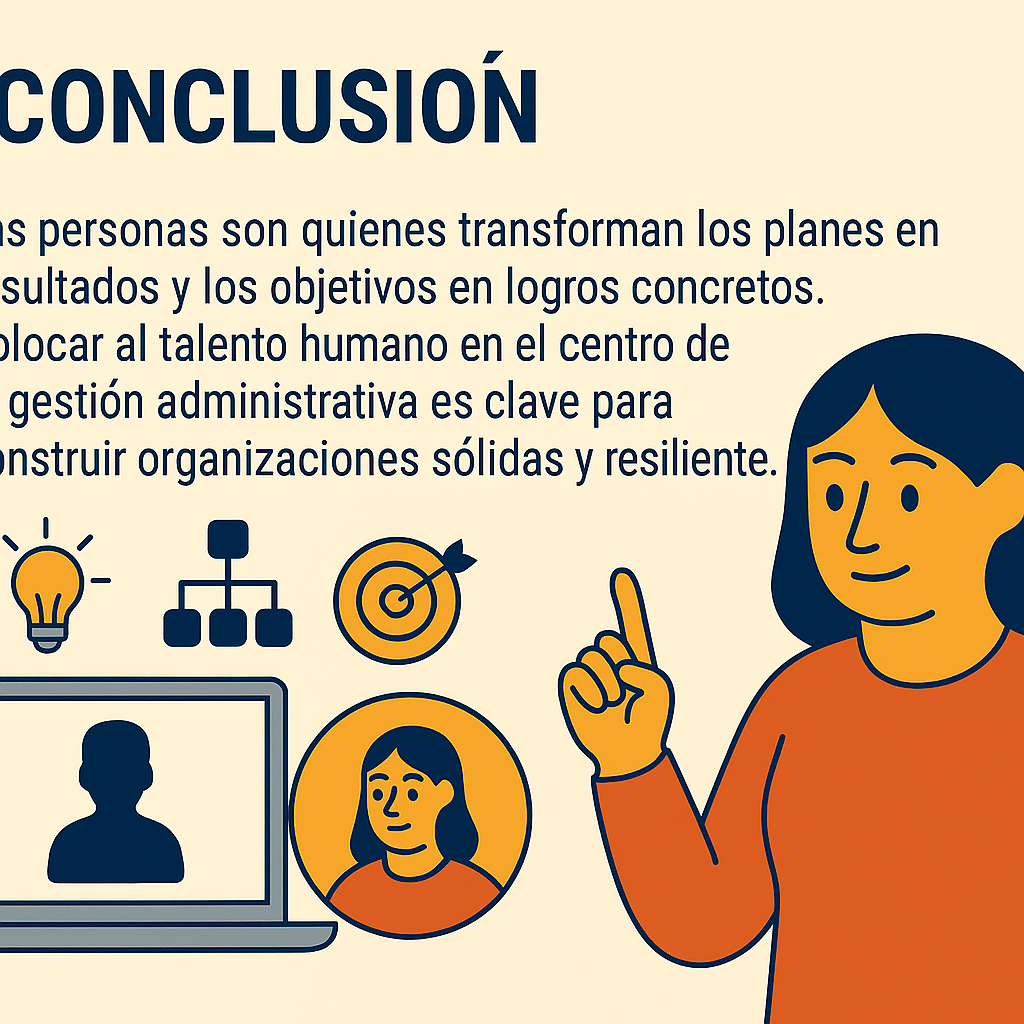 La gestión administrativa del talento humano representa uno de los pilares más importantes para el éxito y la sostenibilidad de cualquier organización. A lo largo de los temas abordados en el módulo 1, se evidencia que el talento humano no debe entenderse únicamente como un recurso operativo, sino como un elemento estratégico que impulsa el crecimiento, la innovación y la competitividad empresarial. Las personas son quienes transforman los planes en resultados y los objetivos en logros concretos.